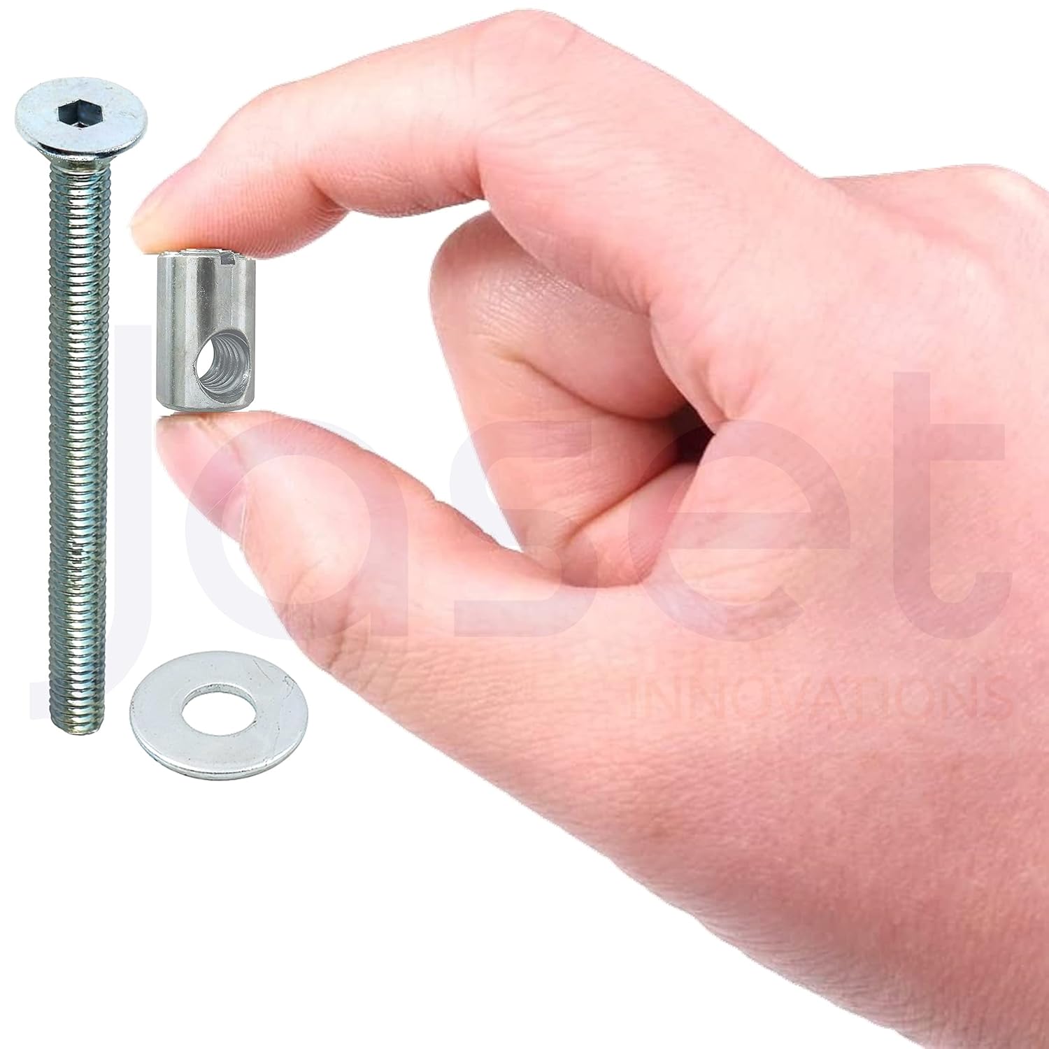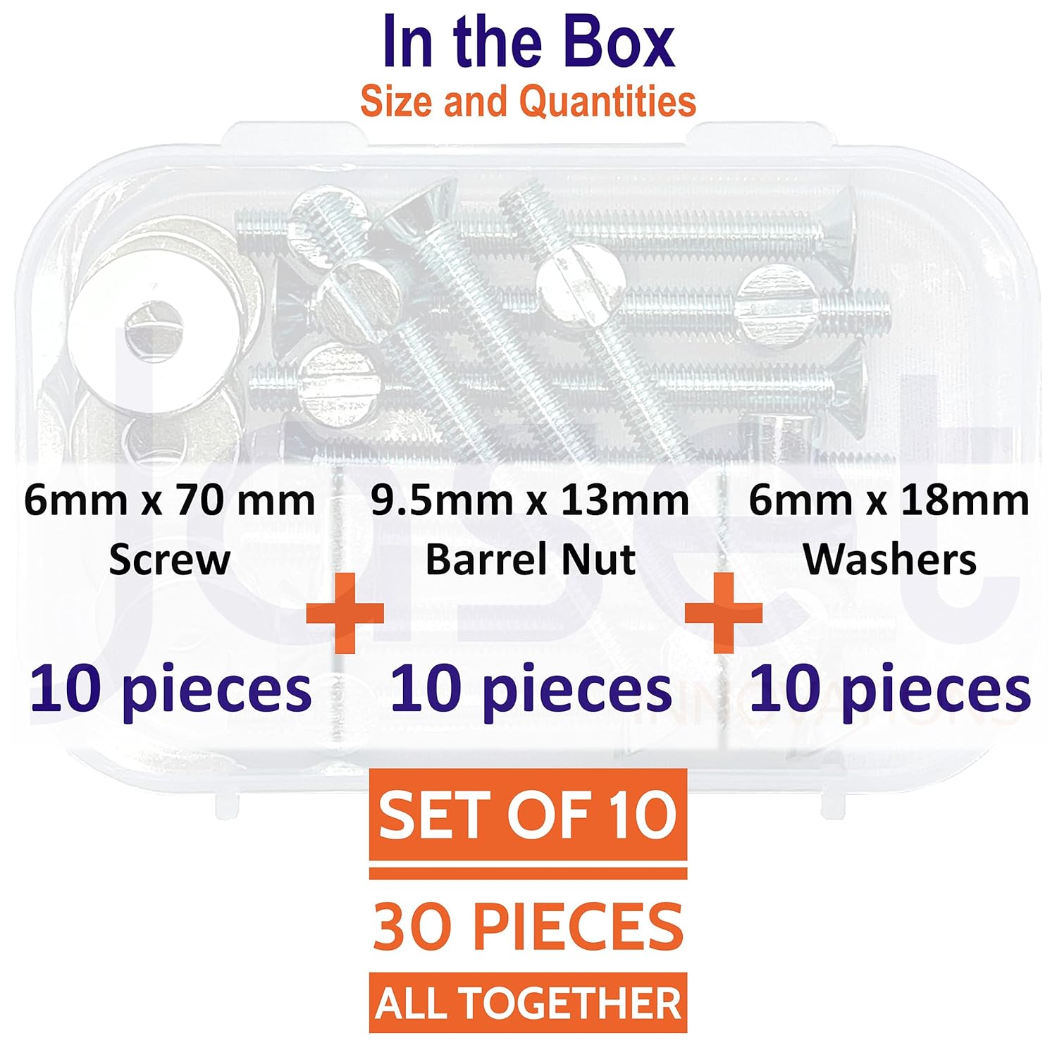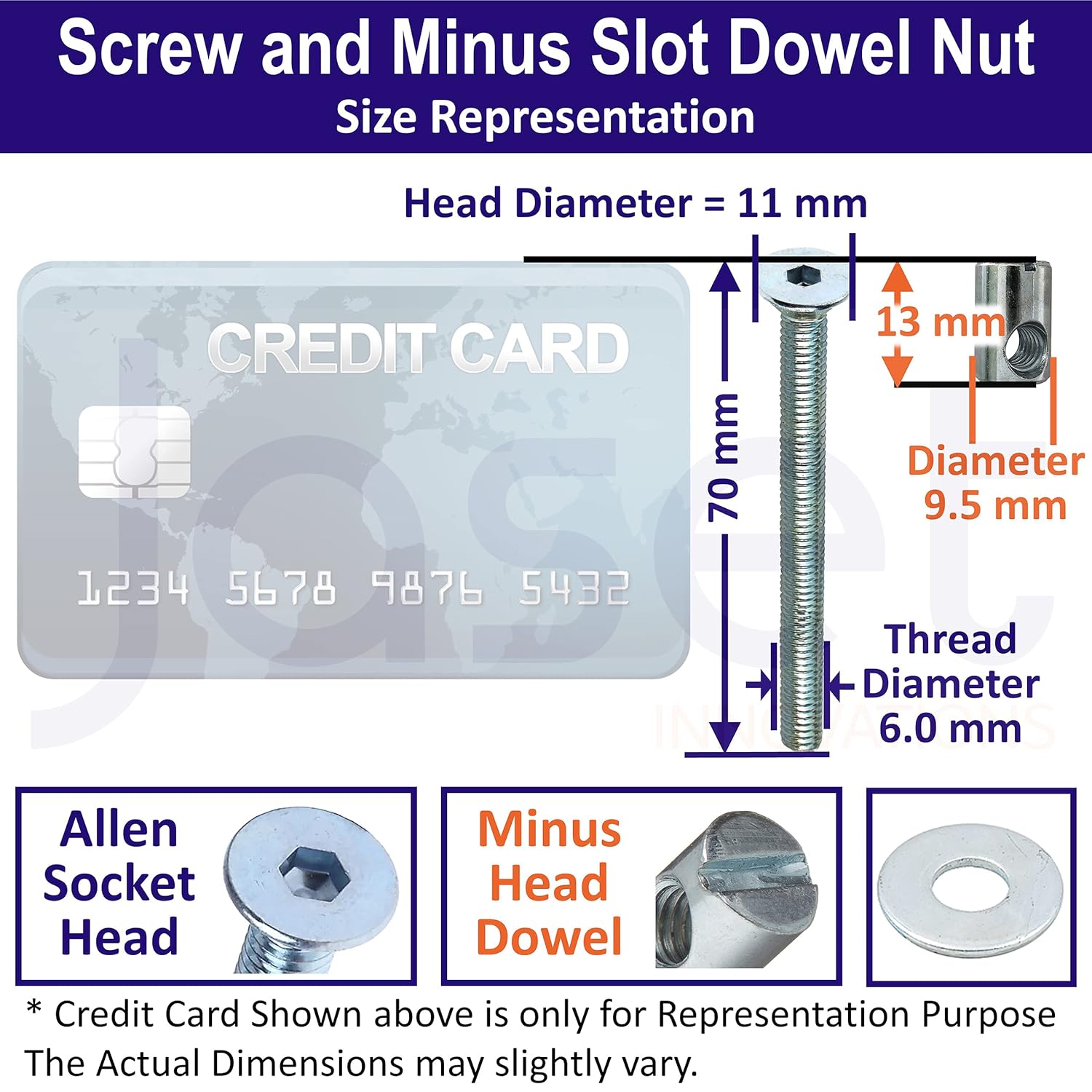 - QUANTITY - Set of 10, 6mm Thread and 70mm Length Allen Socket Head Counter Sunk Screw=10 pcs pack, Corresponding Barrel Nut / Dowel Nuts=10pcs, Corresponding Washers=10 pcs. No Warranty.