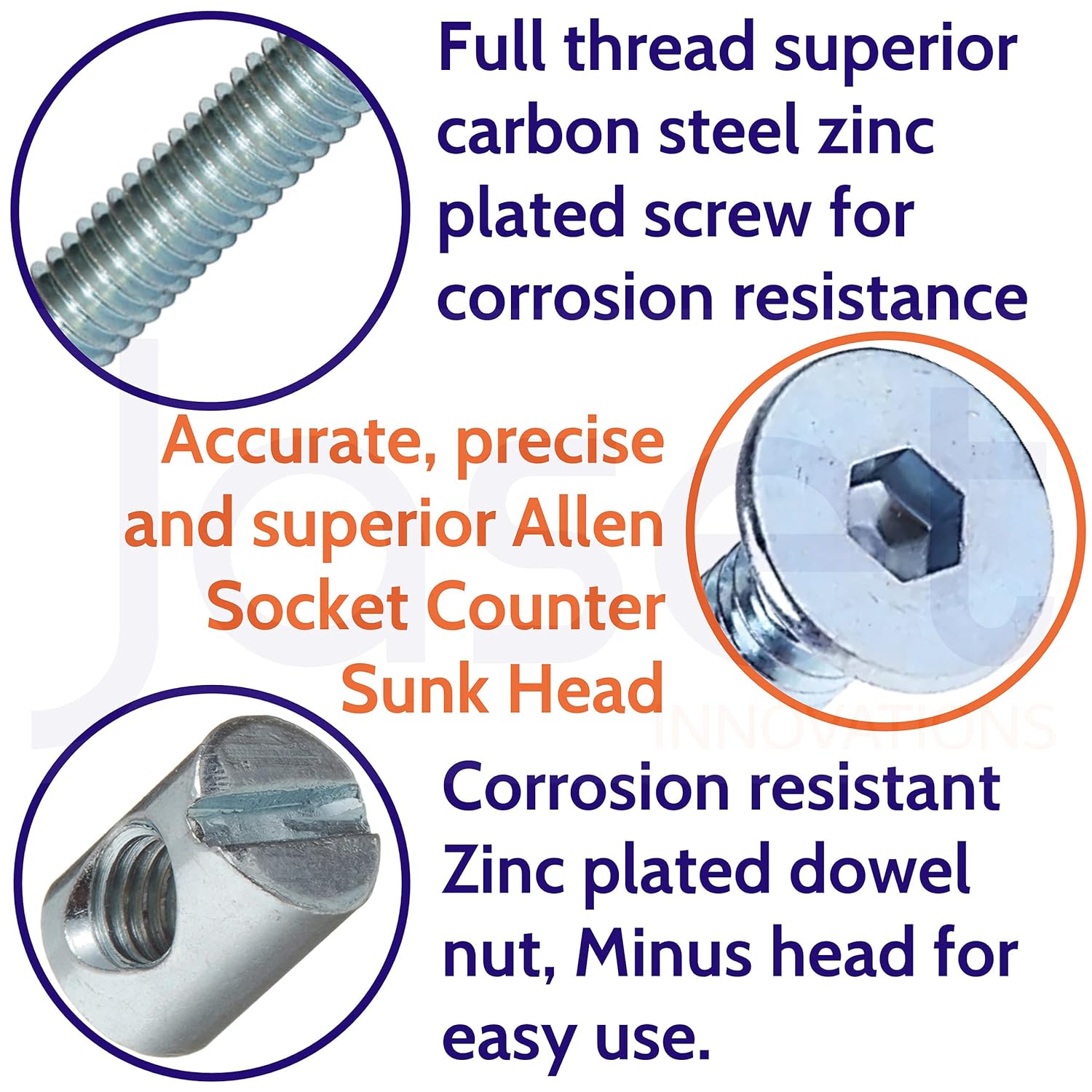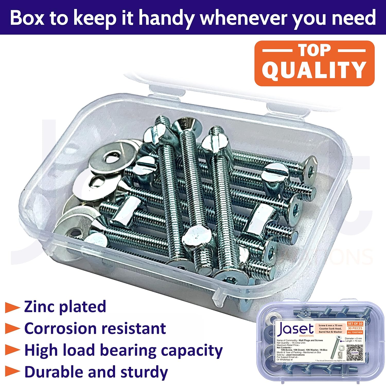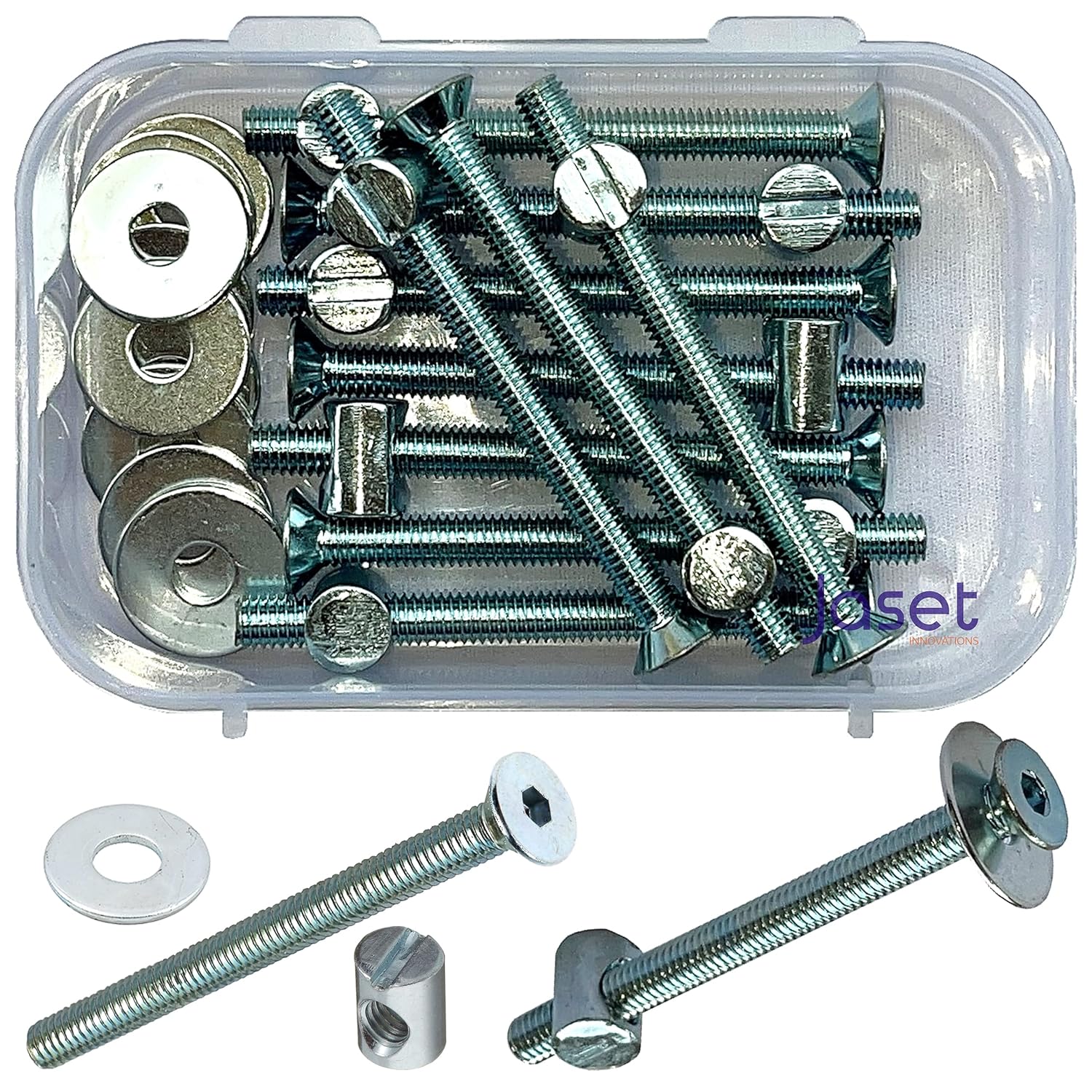 - QUANTITY - Set of 10, 6mm Thread and 70mm Length Allen Socket Head Counter Sunk Screw=10 pcs pack, Corresponding Barrel Nut / Dowel Nuts=10pcs, Corresponding Washers=10 pcs. No Warranty.