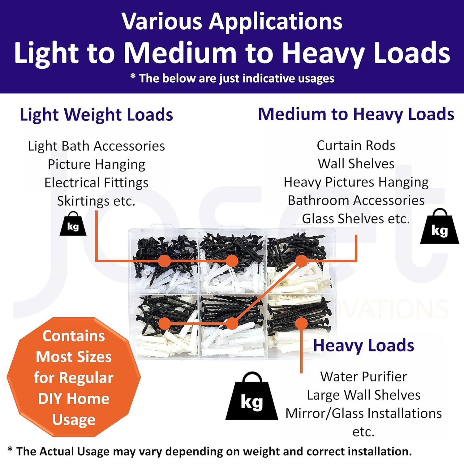 - ALL SIZES FOR YOUR DIY USE – The Assorted kit contains most used sizes from light to medium to heavy weight fixtures for your Indoors or Outdoors Hanging solutions like Blinds, Curtains, Hang Heavy Items - Pictures, Kitchen, Bathroom Racks, Home, Office, Shop Lighting Fixtures, Mirrors & Accessories, Cabinets, Bookshelf, Furniture, Shelf Mounting, Art Hanger, Photo Frame Hangers. These can be used on a wide variety of materials and are ideal for home, office, and shop use.