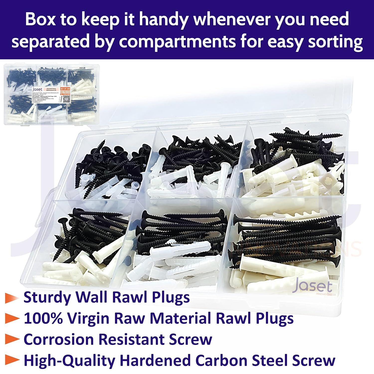 Sahmbi Wall Rawl Plugs/Gitti and Matching Dry Wall Screws – Assorted Set – DIY Home Maintenance Kit with Storage Box (Set of 240 = Total 480 Pieces)