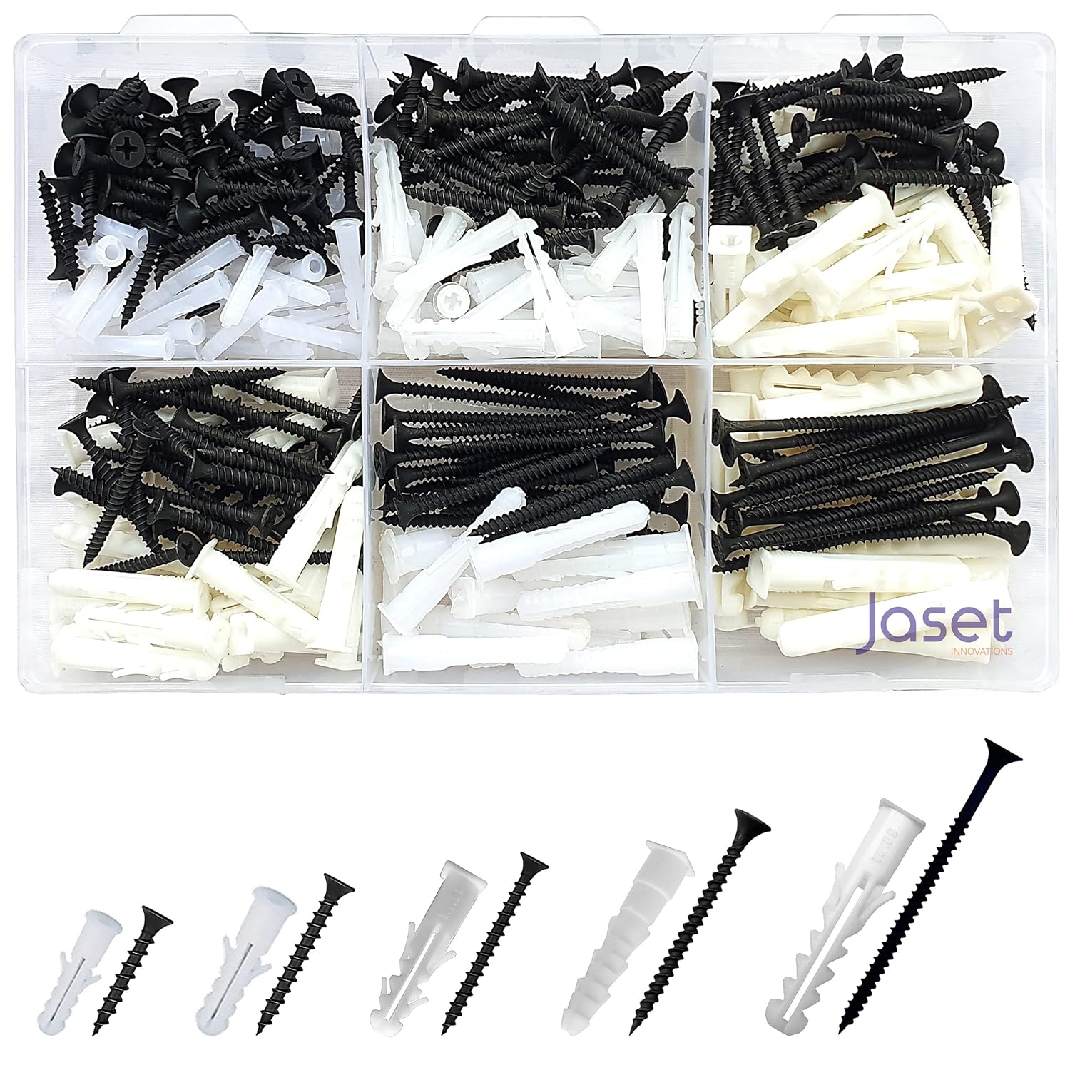 - PACKAGE CONTENTS: Wall Plugs 25mm = 85 pcs, 30mm = 55 pcs, 35mm = 60 pcs, 40mm = 25 pcs, and 50mm = 15 pcs. Drywall Screw: (Gauge #6) 3.5x25mm = 85 pcs, 3.5x32mm = 55 pcs, 3.5x38mm = 60 pcs, 3.5x50mm = 25 pcs and 3.5x60mm = 15 pcs. Set of 240 = Total 480 pieces along with storage box. Please see images for more details.