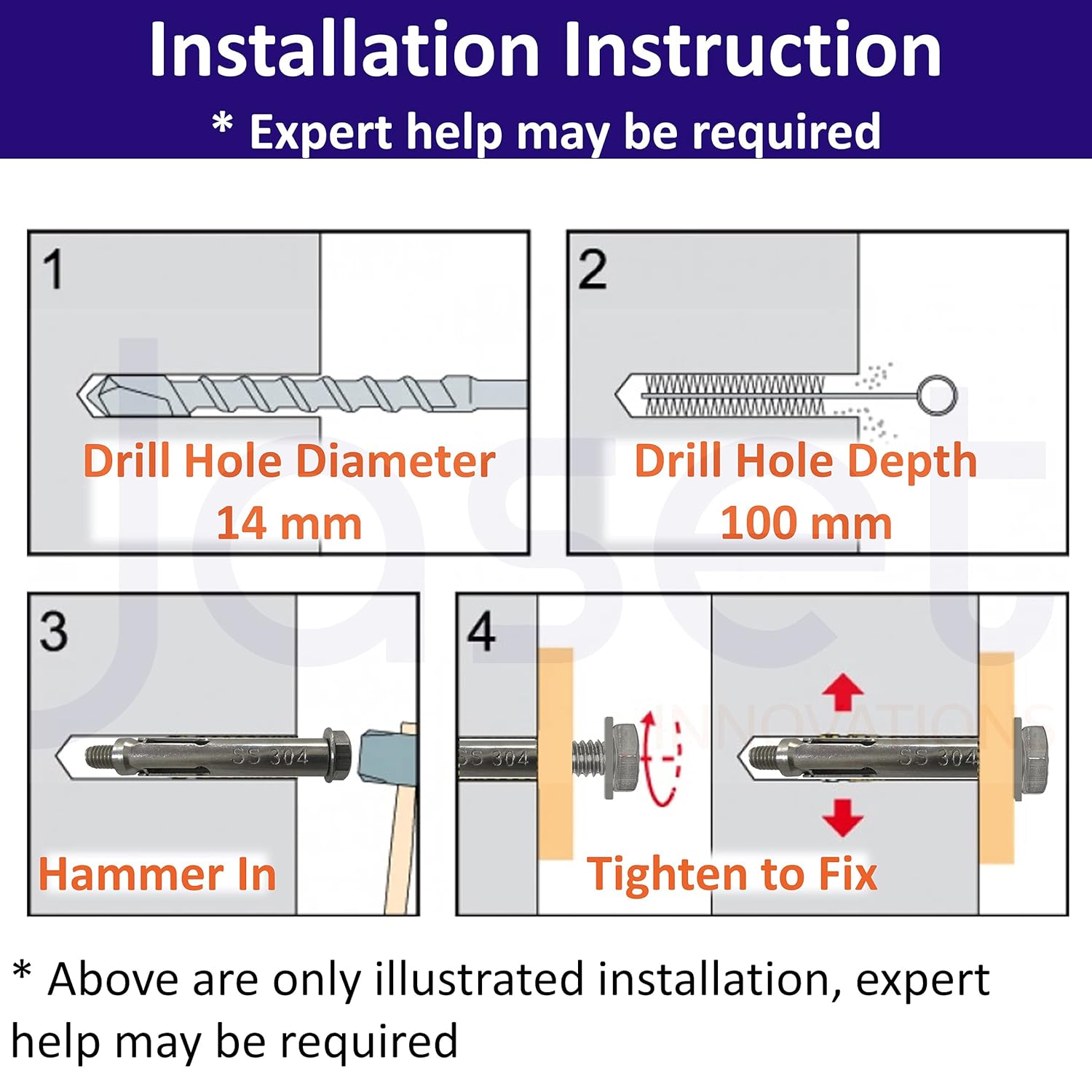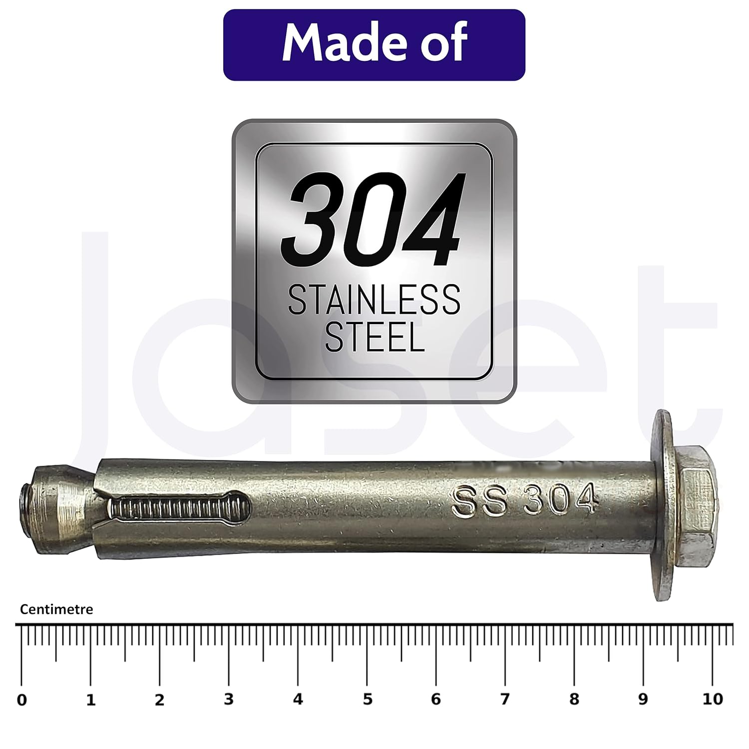 304 GRADE STAINLESS STEEL FASTENERS are RUST PROOF, durable to use and are good for MULTIPURPOSE USE, Indoor or Outdoor for many HEAVY DUTY Applications. These Fastener have high load bearing capacity and can be used in various household, indoor and outdoor applications. HEX TYPE BOLT HEAD is easy to tighten and HIGH-QUALITY 304 Grade Stainless Steel is easy to use multiple times due to high resistance to corrosion in most of the harsh environments. DIMENSIONS - 10mm Hex Bolt Diameter, 100mm Bolt Length, Approx. 14mm Sleeve Diameter (10mm x100mm). QUANTITY - Set of 1 piece Stainless Steel Anchor Fastener Expansion Type. Recommended Drill Bit Diameter = 14mm. Minimum Qty to Buy = 2 pieces.
