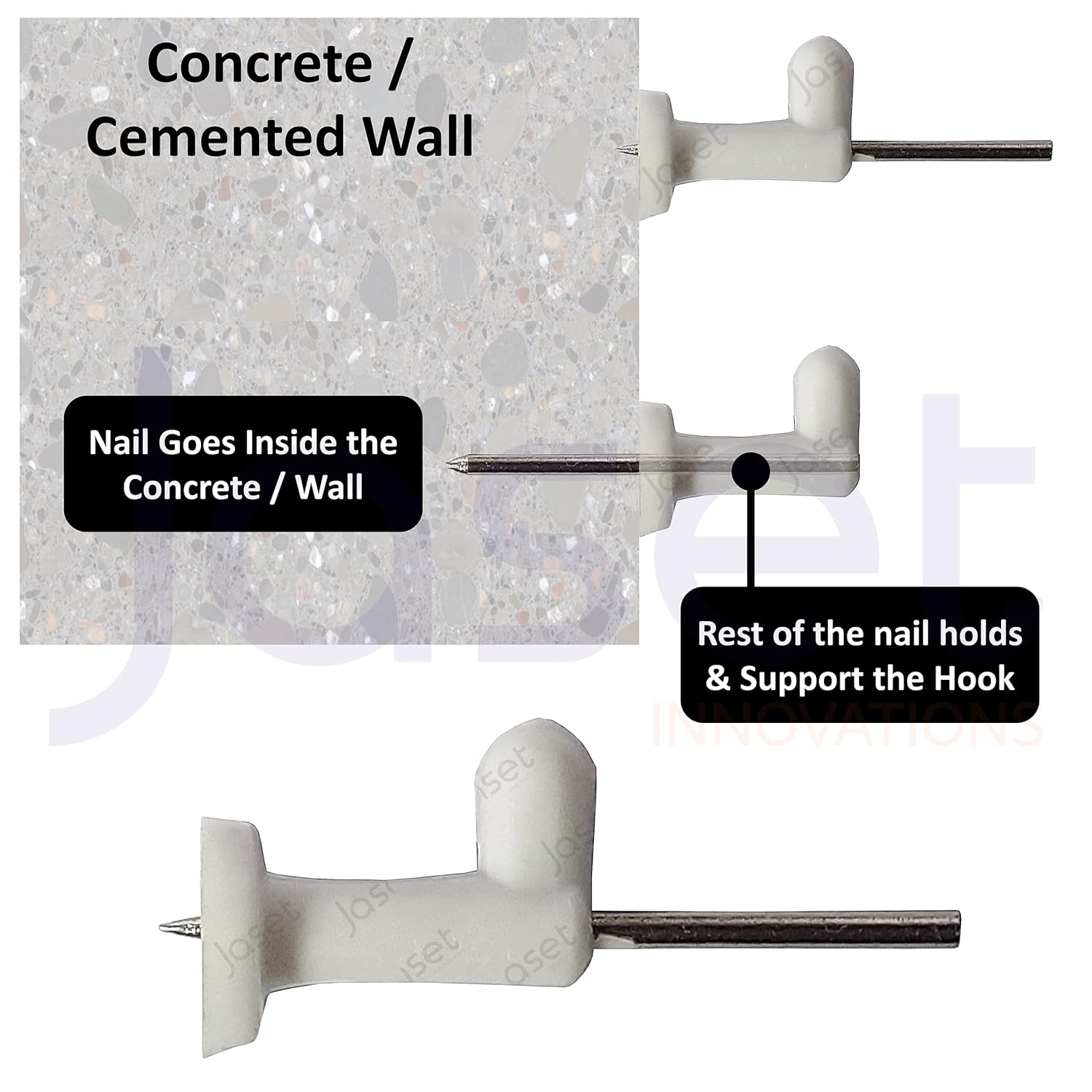 - SIMPLE AND CONVENIENT INSTALLATION – Gently hammer the steel nail into the concrete wall until nail end is even with the white plastic hook top, and no trace will be left. Do not hammer on the plastic part which will be easily broken.